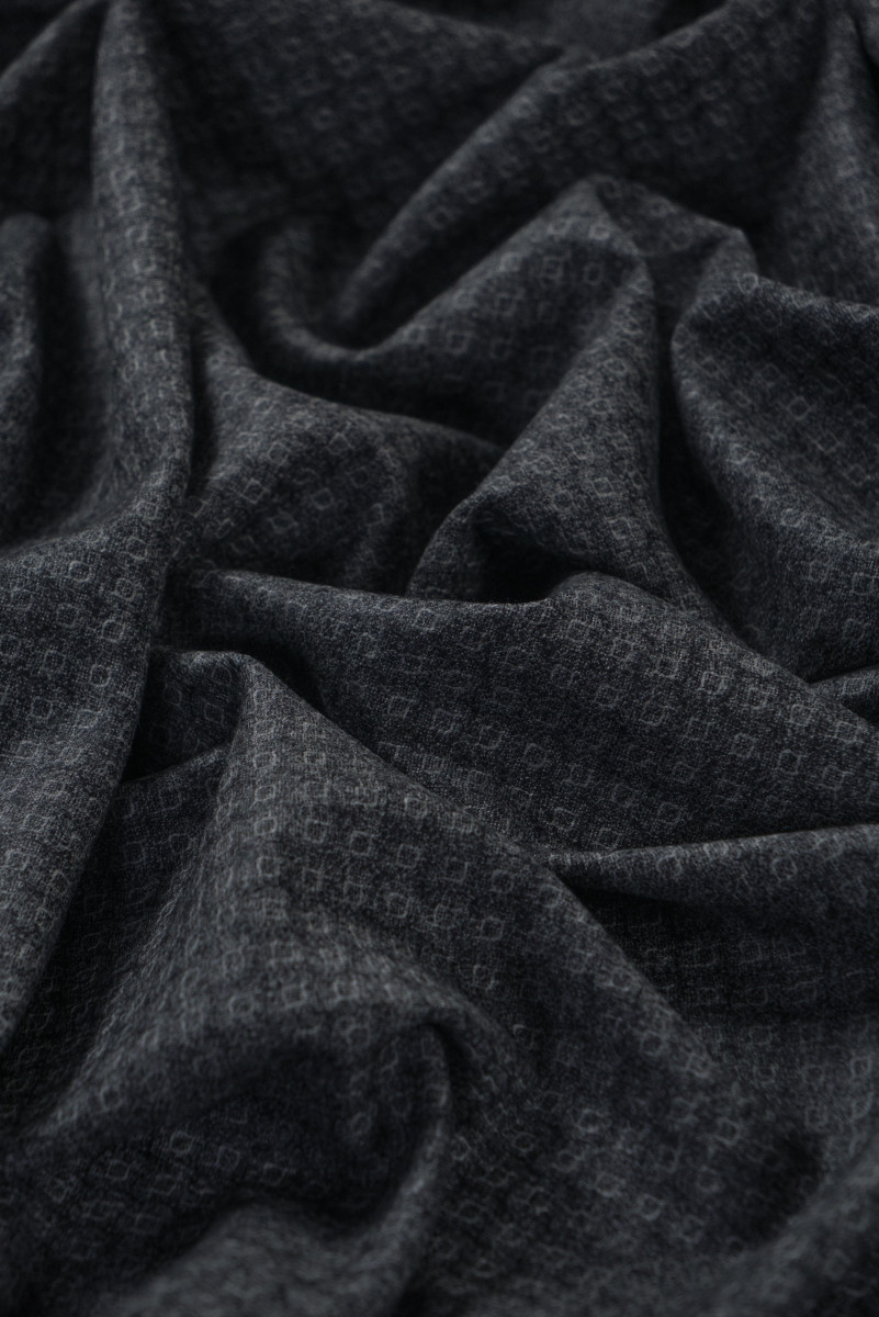 Itāļu kostīmu vilna pelēkā krāsā - divpusēja. Vienā pusē ir "svaru" motīvs, bet otrā pusē ir asaras un rombu motīvs. Mīksts, mīksts, neelastīgs rudens-ziemas žanra audums - lieliski piemērots kostīma, uzvalka, bikšu, svārku, kleitas šūšanai.