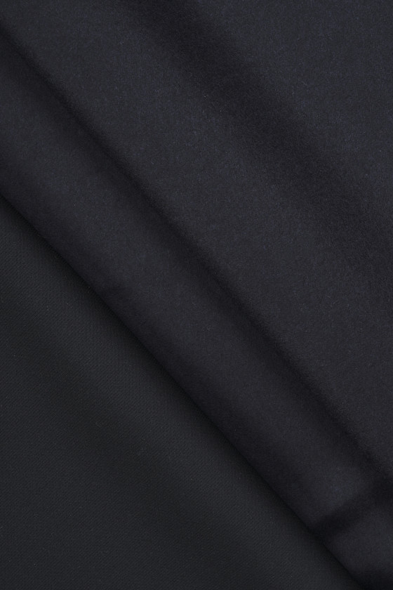 Itāļu mētelis vilna bēšā tumši tumši zilā krāsā, kas izklāta ar melnām putām.