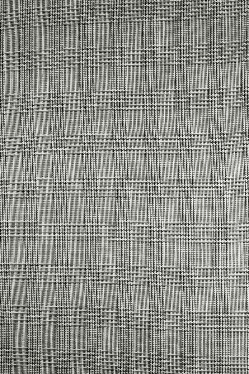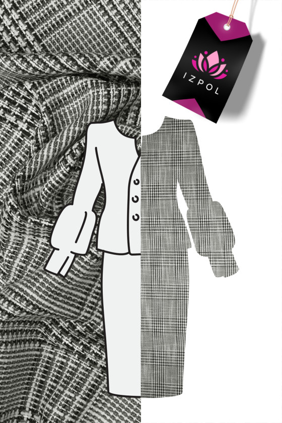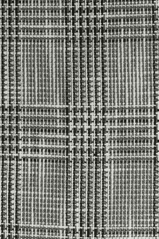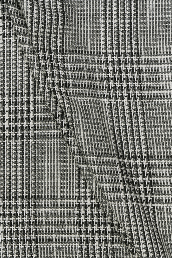 Itāļu, biezāka kostīmu vilna ar lielu čekas motīvu (10 cm) melnā, pelēkā, sudraba un écru. Biezāks, neelastīgs, austam audums - lieliski piemērots kostīma, plānākas jakas vai mēteļa šūšanai.