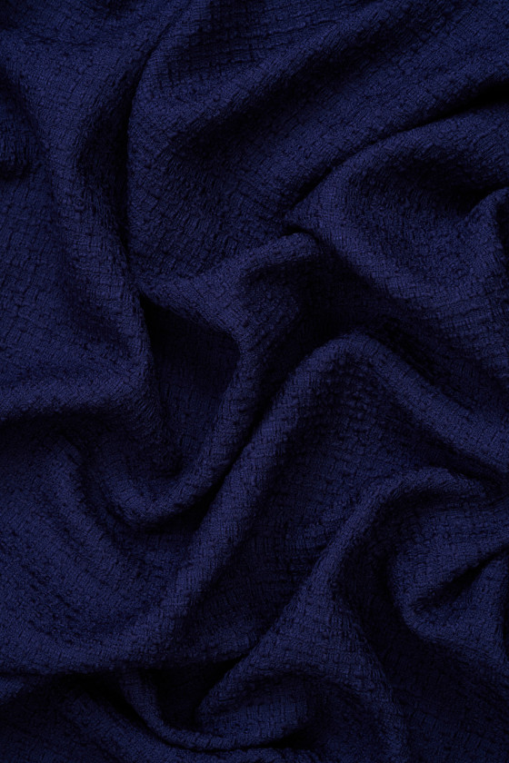 Itāļu chanel vilna ar smalku boucle austu tumši zilā krāsā. Augstākās kvalitātes audums, kas nāk no vienas no slavenākajām rūpnīcām Itālijā. Ir pieejamas arī citas krāsas