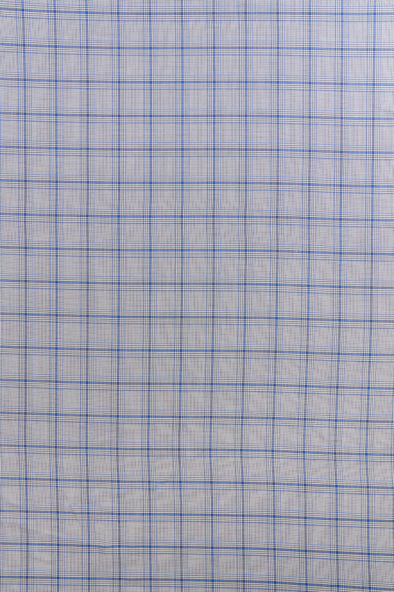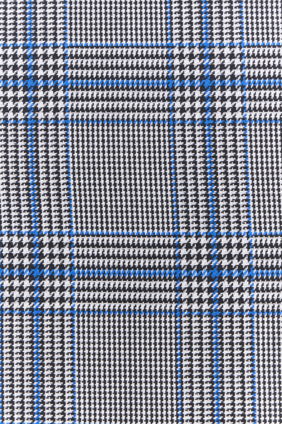 Augstas kvalitātes itāļu kostīmu audums ar lielu zilu čeku motīvu uz krēmmelna fona. Biezāks, neelastīgs audums, rudens-ziemas tipa, divpusējs - otra puse ir izgatavota zilā krāsā. Režģa izmērs 10cm*10cm. Fantastisks piedāvājums izveidot jaku, kleitu vai svārkus.