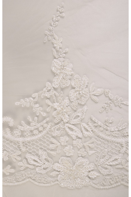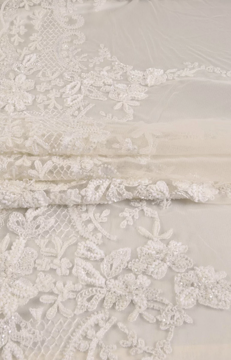 Ecru mežģīnes, ideāli piemērotas kāzu tērpu apdarei vai korsetes šūšanai, raksta augstums no 12-30 cm. Audums pēdējā kuponā 60*260cm, bagātīgi apdarināts ar pērlītēm un pērlēm.