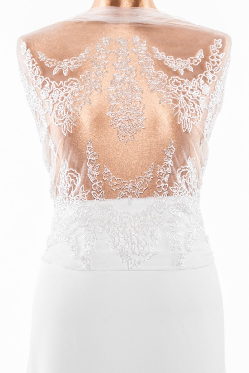 Itāļu kāzu aplikācija korsetes formā krēmkrāsā. Skaisti, lieli motīvi ar ziediem (18 cm), kas izgatavoti no caurspīdīgām pērlītēm, veido divas svītras. Pieteikums ir lieliski piemērots kāzu kleitai, vakarkleitai vai blūzei.