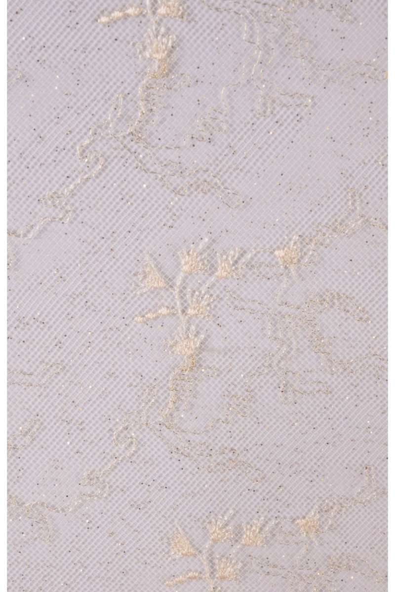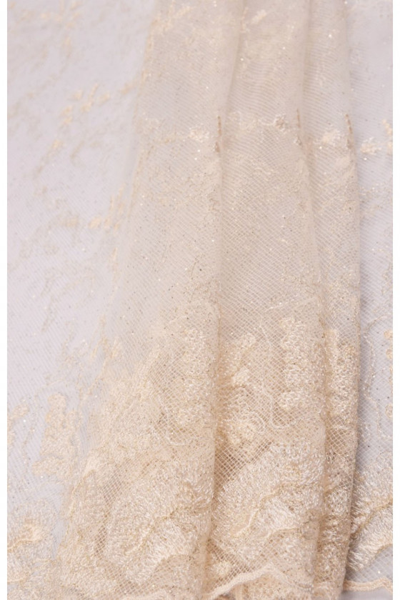 Franču kāzu mežģīnes ar smalku, klasisku ecru rakstu, kas no abām pusēm pabeigts ar dekoratīvu zobu. Mežģīnes ir smalki dekorētas ar lurex diegu un mirdzumu (tas nenokrīt), kas padara to skaisti dzirkstošu.