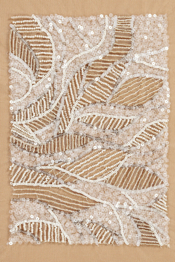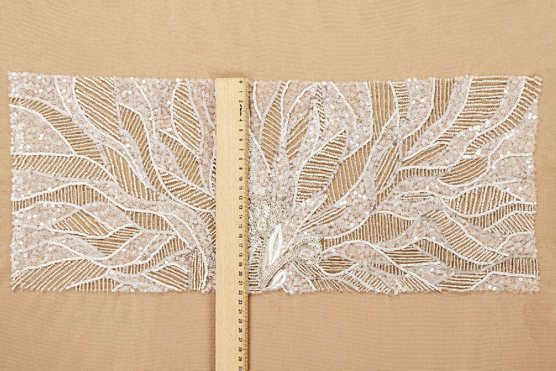 Korsetes pielietojums sastāv no trim daļām: priekšējās un divas aizmugurējās daļas. Skaists lapu motīvs, kas blīvi dekorēts ar fliteriem un pērlītēm.
