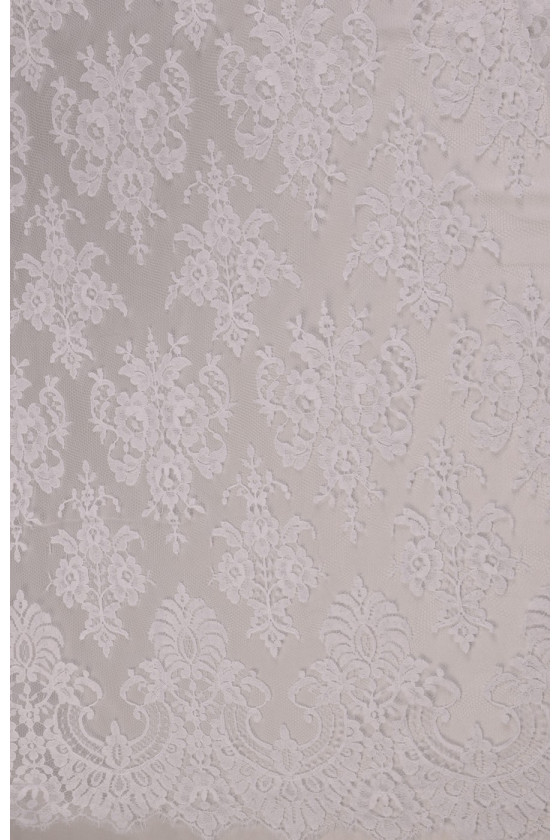 Pēdējais kāzu mežģīņu kupons ar izmēriem 120 cm * 180 cm, ar klasisku, blīvu rakstu baltā krēmkrāsā, pabeigts ar zobu abās pusēs. Mežģīnes ir maigas, mīkstas uz tausti.