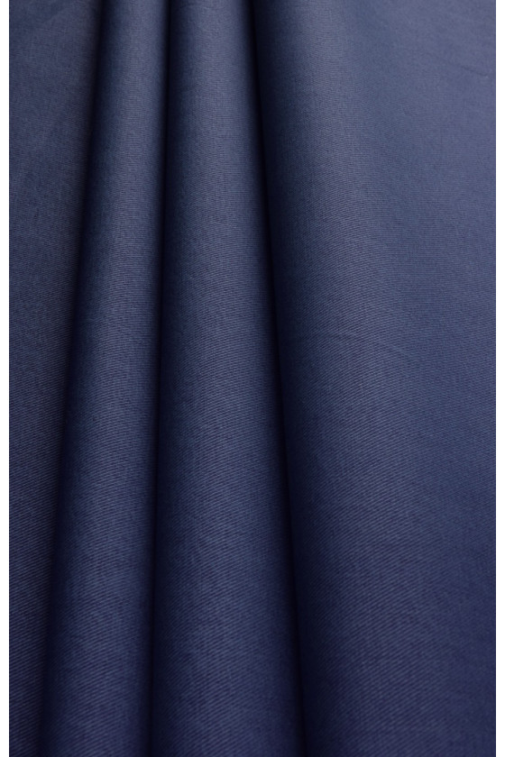 Itāļu kokvilnas audums tumši zilā krāsā. Elastīgs, stīvs audums ar sarža pinumu - atgādina džinsa audumu. Ideāli piemērots bikšu, svārku, kleitas vai šortu šūšanai.