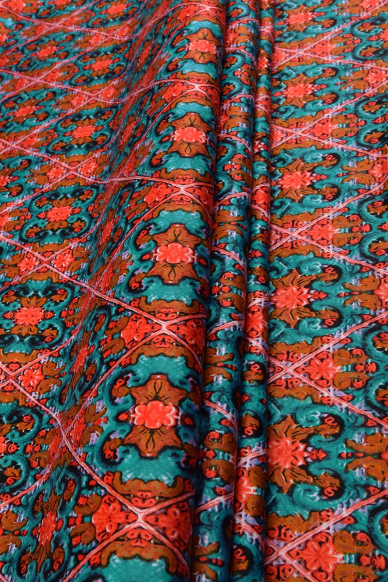 Krāsaina kokvilna, nedaudz elastīga. Dekoratīvs, krāsains raksts, kas ievietots dimantos. Krāsas: tirkīza, brūna un spilgti sarkana. Priekšlikums kleitu, svārku, bikšu šūšanai.