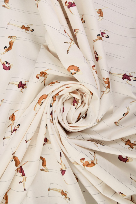 Elastīgs kokvilnas ecru ar oriģinālu akrobātu rakstu (daudzas figūras apmēram 5 cm). Auduma svars ir lieliski piemērots kleitām, svārkiem, biksēm vai rotājumiem
