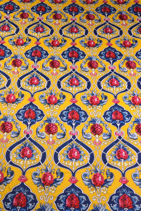 Kokvilna, kas apdrukāta krāsainā, dekoratīvā rakstā ar apmēram 10 cm lieliem augļiem. Audums ir 100% dabīgs, stabils. Priekšlikums vasaras kleitu, svārku, bikšu šūšanai. Tas var būt arī interesants dekoratīvs audums. Krāsas: dzeltena, sarkana, tumši zila.