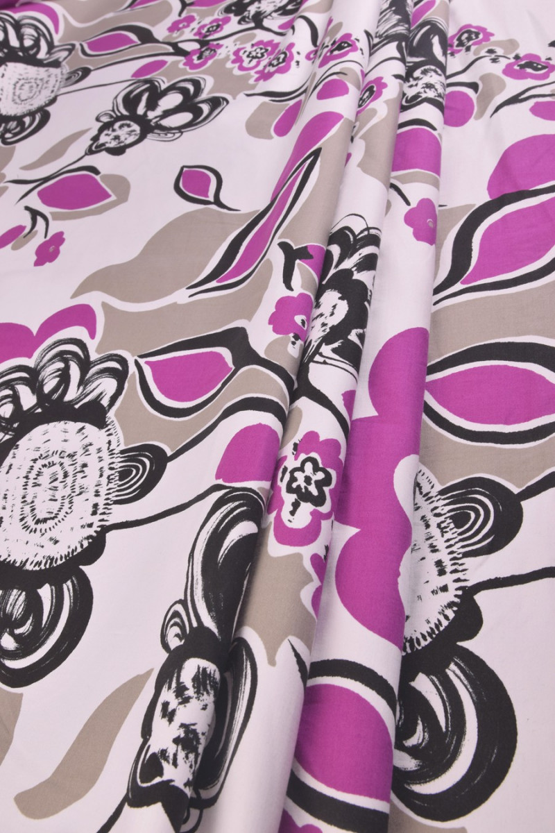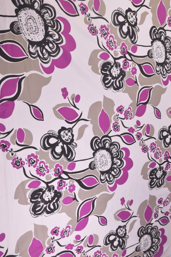 Apdrukāta kokvilna, elastīga, biezāka ar lielu, krāsotu ziedu rakstu. Krāsas: ziedi violetā, melnā un olīvu bēšā krāsā uz ecru.