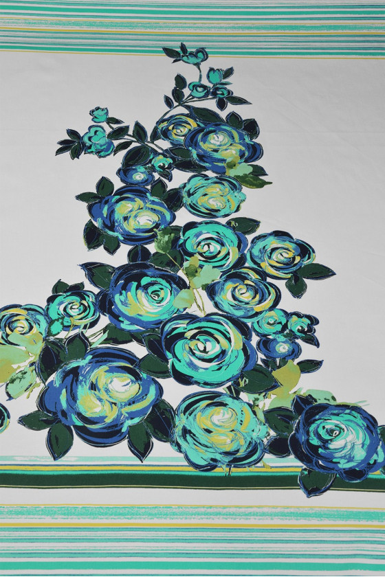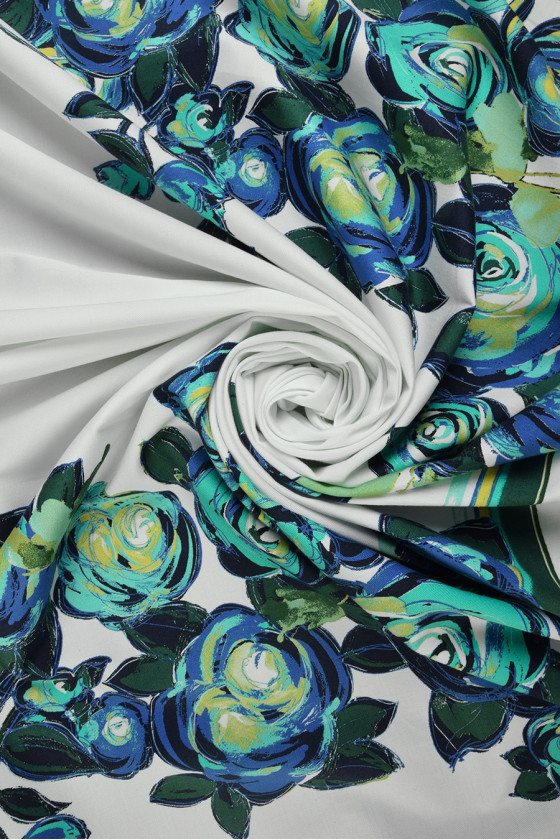 Elastīga kokvilna, apdrukāta ar zaļiem un tumši ziliem ziediem uz balta fona. Kupona apakšā un augšpusē ir zaļas un dzeltenas svītras. Viss ziedu modelis ir apmēram 70 cm garš. Priekšlikums tuniku, blūžu, kleitu šūšanai