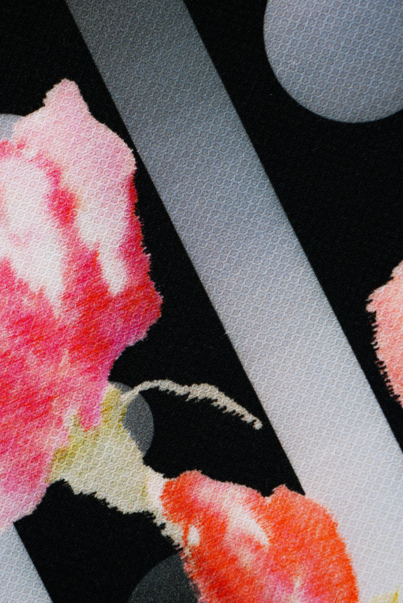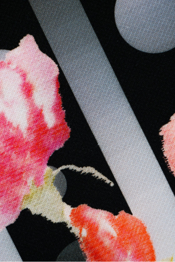 Itāļu kokvilna kuponā ar izmēriem 110 cm* 150 cm. Audums ar ļoti interesantu žakarda austu. Kupona augšējā daļā ir lielu polka punktu motīvs (4,5 cm un 2 cm), apakšējā daļa ir krāsotas rozes uz pelēkām un melnām svītrām. Elastīgs, nedaudz stīvs, matēts audums - lieliski piemērots kleitas vai svārku šūšanai.
