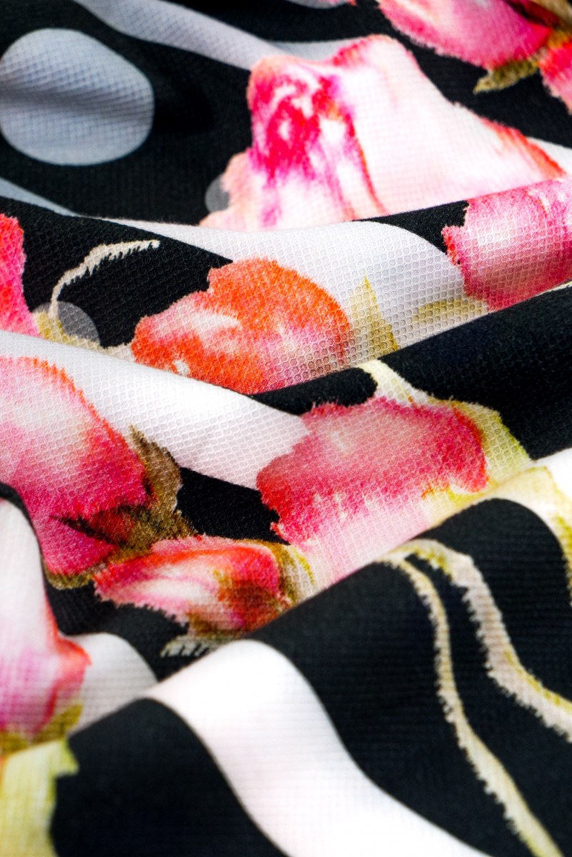 Itāļu kokvilna kuponā ar izmēriem 110 cm* 150 cm. Audums ar ļoti interesantu žakarda austu. Kupona augšējā daļā ir lielu polka punktu motīvs (4,5 cm un 2 cm), apakšējā daļa ir krāsotas rozes uz pelēkām un melnām svītrām.