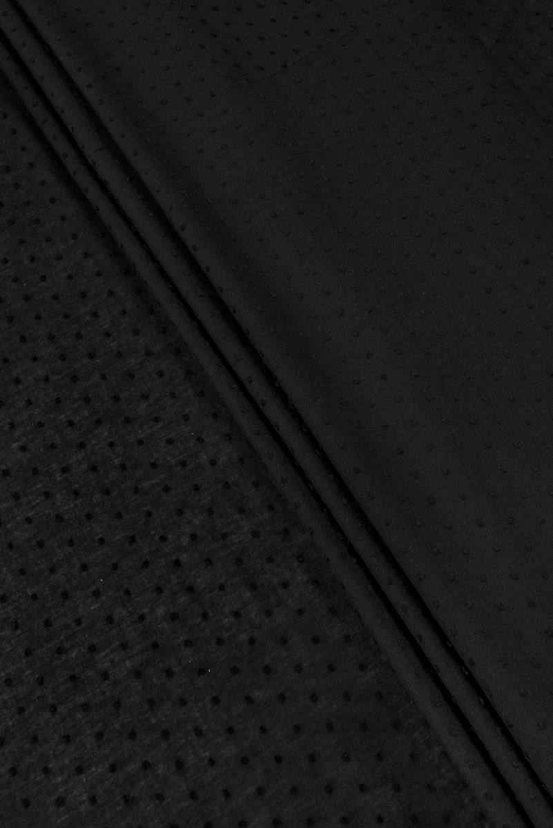 Itāļu 100% kokvilnas batiste audums melnā krāsā ar mezglotu motīvu. Kokvilnas batiste ir dabisks, maigs, gaisīgs, nedaudz caurspīdīgs audums - ideāli piemērots vasaras karstumam.