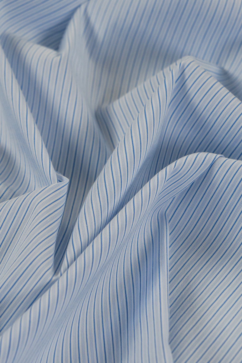Itāļu kokvilnas audums ar šaurām svītrām krēmā un zilā krāsā. Kokvilna ir 100% dabīga šķiedra. Kokvilnas audumi ir izturīgi, ātri nenolietojas, ilgu laiku saglabā savas īpašības, ir pilnīgi elpojoši, elpojoši, kas nodrošina augstu lietošanas komfortu. Neelastīgs, matēts, necaurspīdīgs audums - lieliski piemērots kleitas, krekla, svārku, blūzes vai šortu šūšanai.