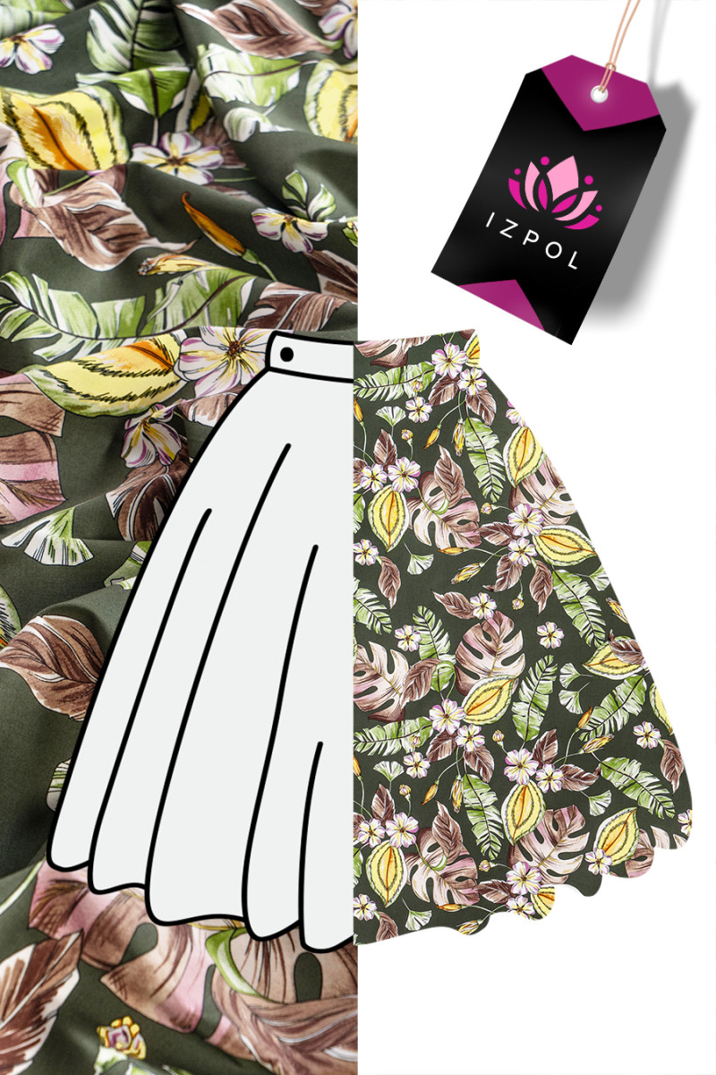 Itāļu kokvilnas audums haki ar eksotisku lapu un ziedu motīvu. Kokvilna ir 100% dabīga šķiedra. Kokvilnas audumi ir izturīgi, ātri nenolietojas, ilgu laiku saglabā savas īpašības, ir pilnīgi elpojoši, elpojoši, kas nodrošina augstu lietošanas komfortu. Elastīgs, matēts, necaurspīdīgs audums - lieliski piemērots kleitas, bikšu, svārku vai šortu šūšanai.