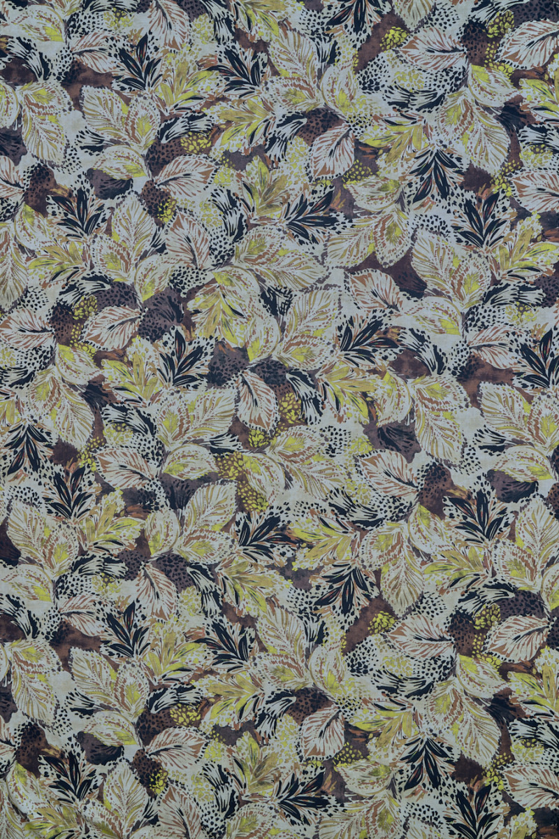 Itāļu 100% kokvilnas audums ar blīvu lapu motīvu zaļā un melnā krāsā uz bēša fona, papildus piepildīts ar tumši brūnu krāsu. Audums ir plāns, mīksts, neelastīgs un austā atgādina lina audumus. Interesants piedāvājums, kas lieliski piemērots vasaras drēbēm - kleitas, svārki, krekli vai šorti.