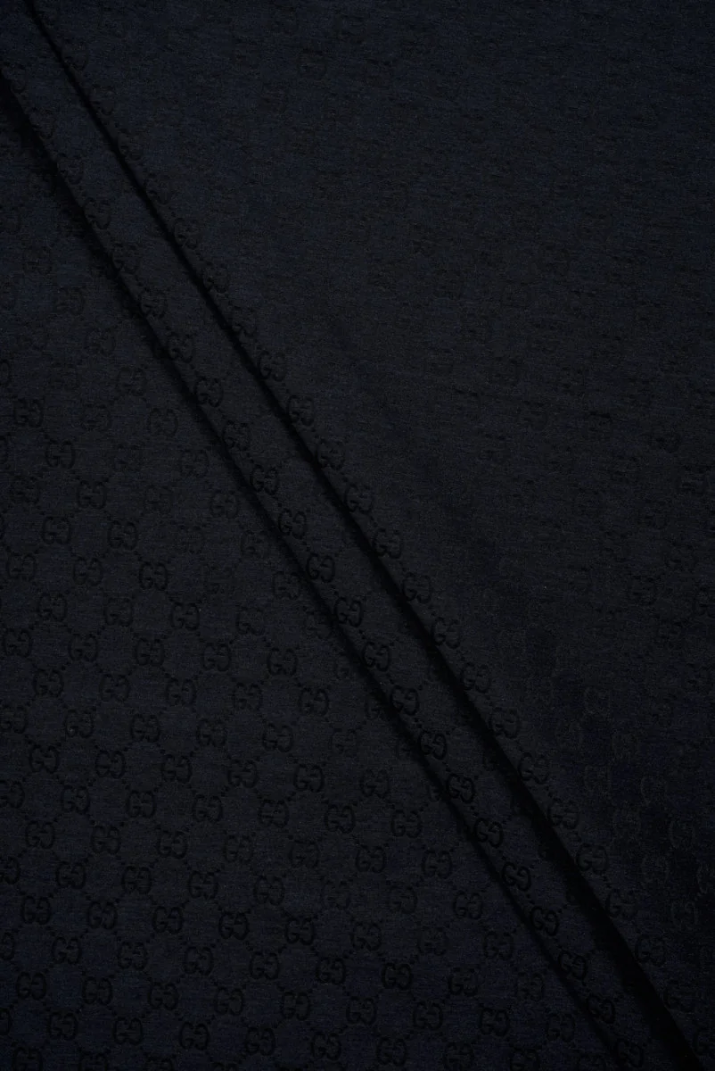 Itāļu kokvilnas audums ar poliamīda piedevu tumši tumši zilā krāsā ar izšūtu burtu motīvu. Raksts ir regulārs, izgatavots melnā krāsā un attēlo pazīstama, globāla modes zīmola simbolus. Viena burta motīva platums ir 1,5 cm, bet augstums - 1,3 cm. Audums ir mīksts, neelastīgs, matēts un diezgan stingrs, atgādina džinsu. Tas ir ideāli piemērots jakas, katana jakas, bikses, kā arī kleitas šūšanai.