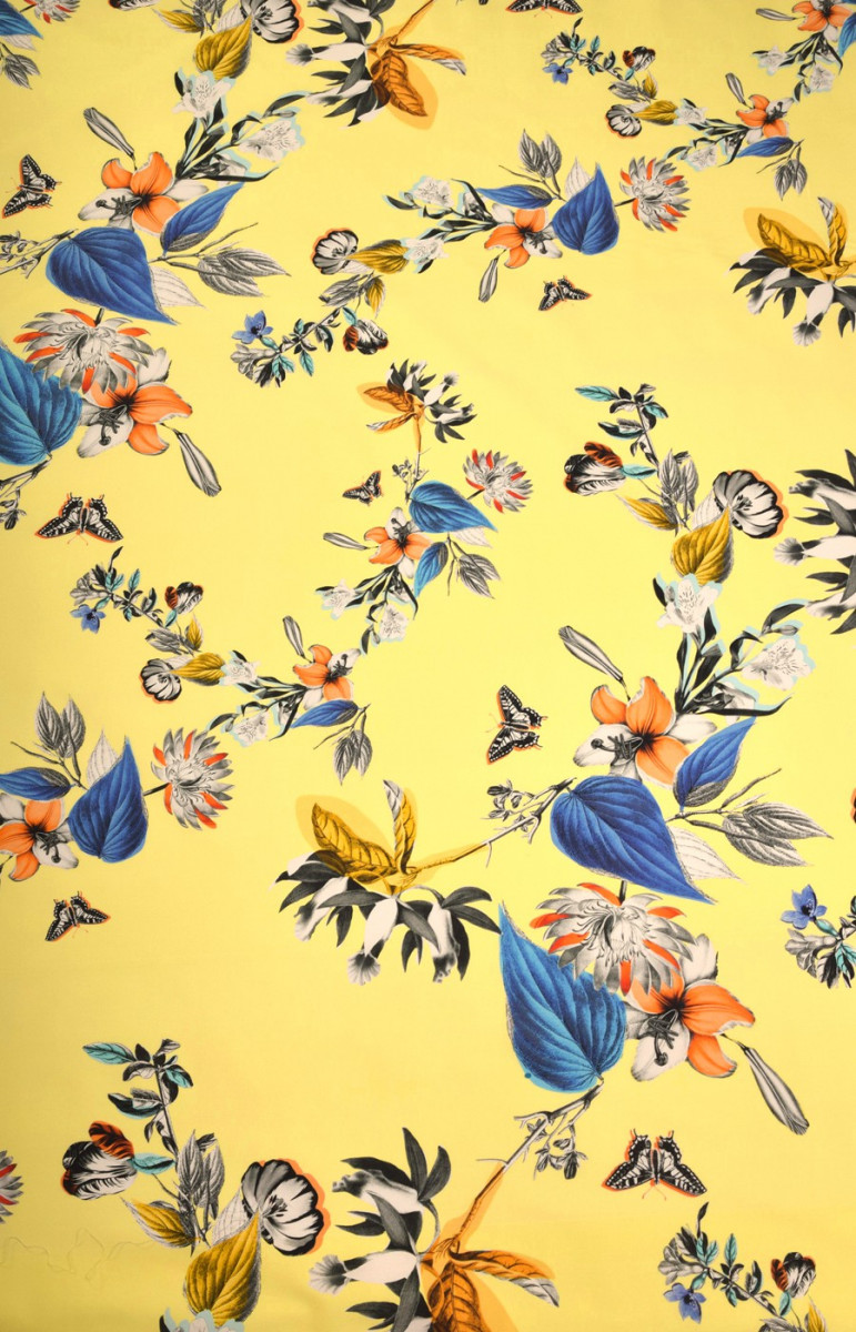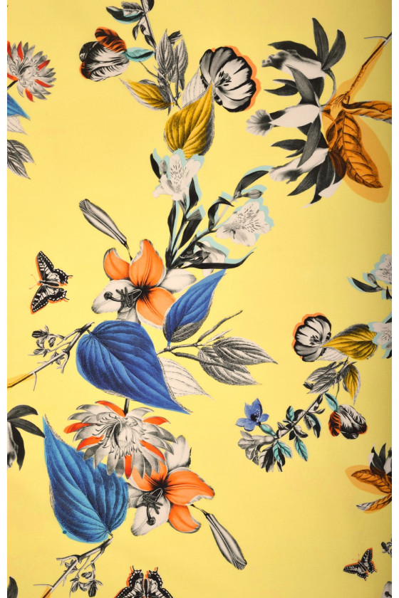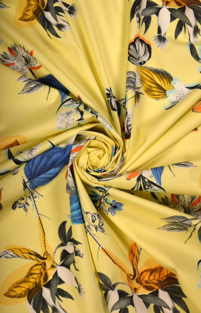 Kokvilna elastīga dzeltenā krāsā ar ziedu apdruku. Mēs to iesakām pieguļošu kleitu, svārku vai bikšu šūšanai.