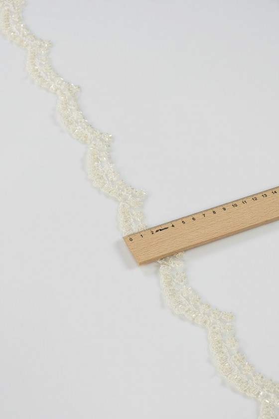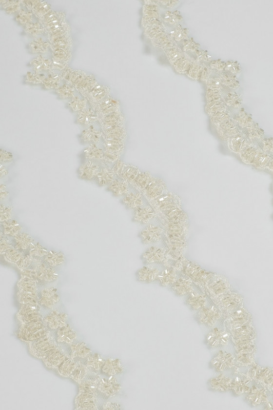 Itāļu galantērijas lente ecru krāsā, pabeigta ar zobu vienā pusē. Mazu ziedu motīvs, kas dekorēts ar pērlītēm. Ideāli piemērots vakara un kāzu audumu apdarei.