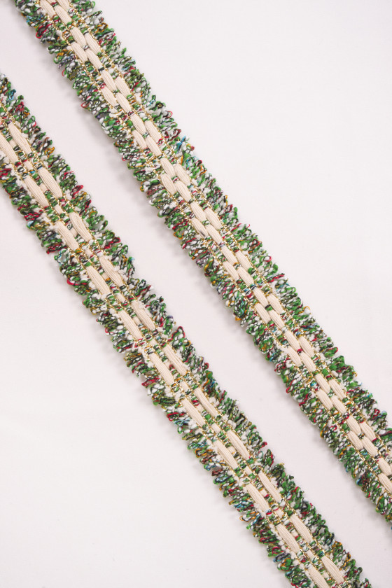 Itāļu galantērijas lente Chanel zaļa, 2,5 cm plata. Lente ir izgatavota dominējošās krāsās: zaļa, krēma, sarkana un dekorēta ar zelta lurex pavedienu. Ideāli piemērots chanel audumu apdarei.