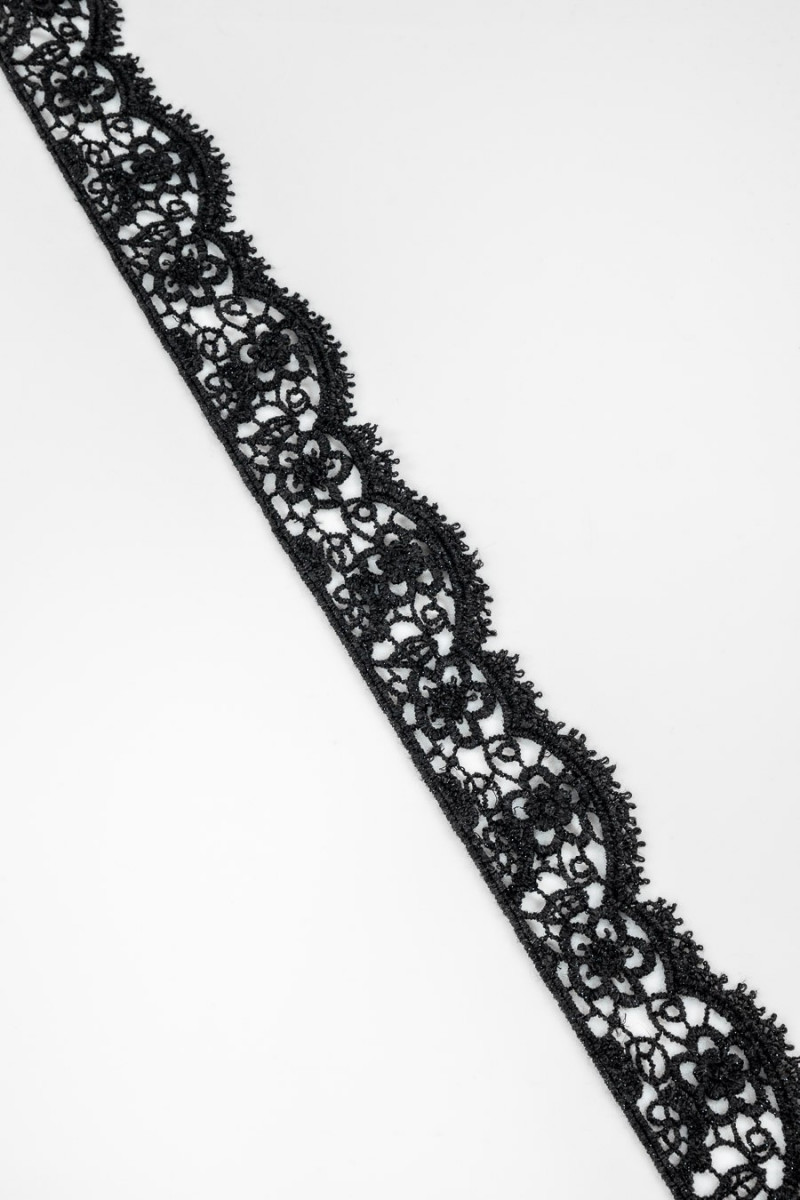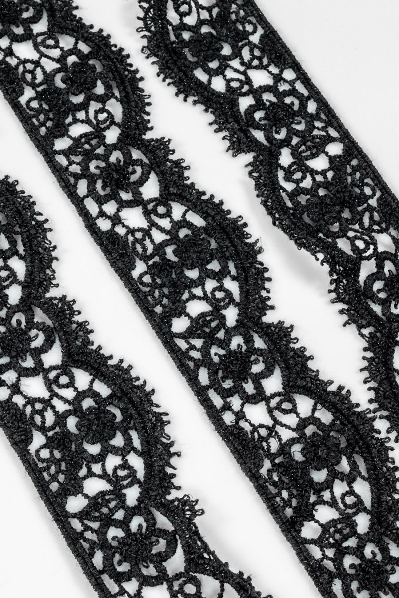 Grafīta krāsas guipure lente, kas savīta ar lurex diegu. Ideāli piemērots kleitu un svārku apdarei.