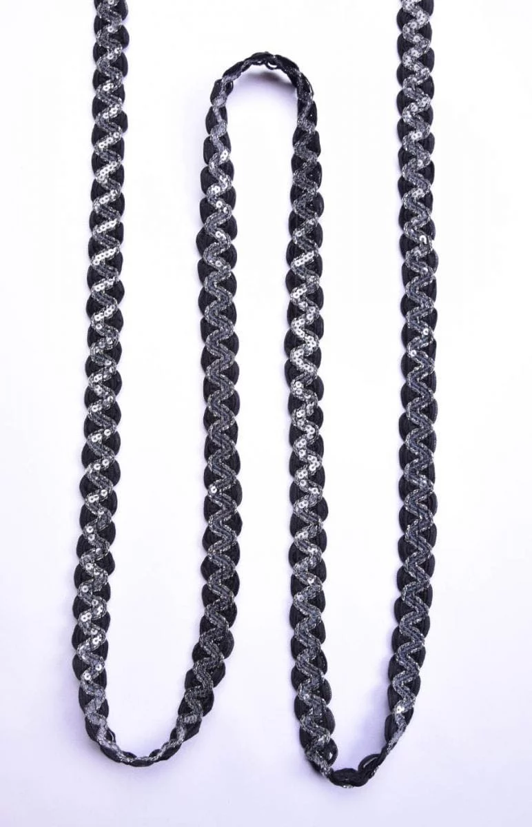 Skaista galantērijas lente ar fliteriem - uz melna fona pelēks zigzags ar caurspīdīgiem fliteriem. Neelastīga lente. Ideāli piemērots apdarei un piederumiem, ieliktņiem.