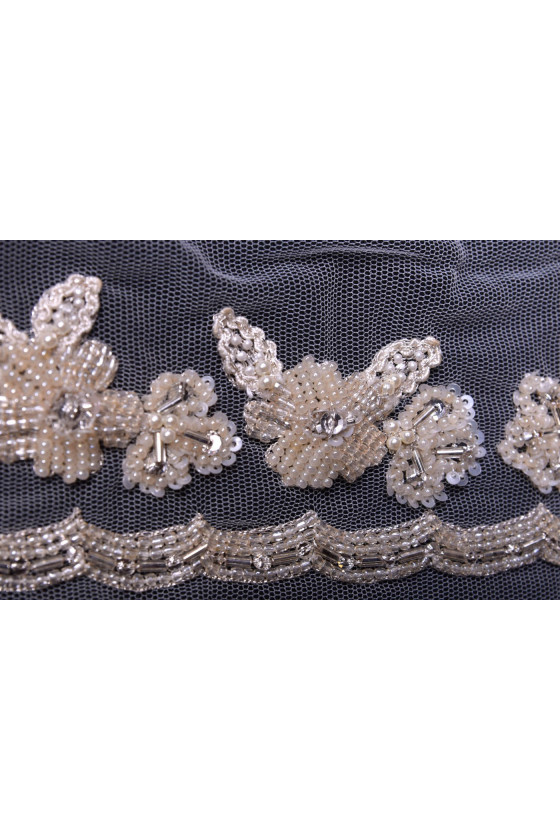 Skaisti pērļota lente. Tas lieliski iederas kāzu un formālo kleitu apdarē. Tilla platums ir apmēram 30 cm, pērlīšu platums ir apmēram 5 cm