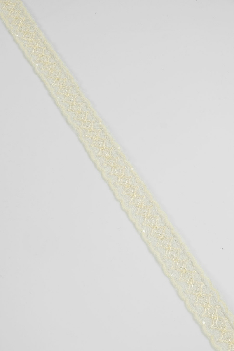 Uz tilla ir izšūti fliteri un krelles. Lente ir apmēram 4 cm plata. Ideāli piemērots kleitu, svārku vai blūžu apdarei.