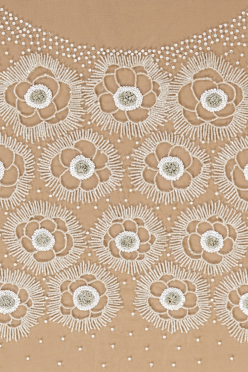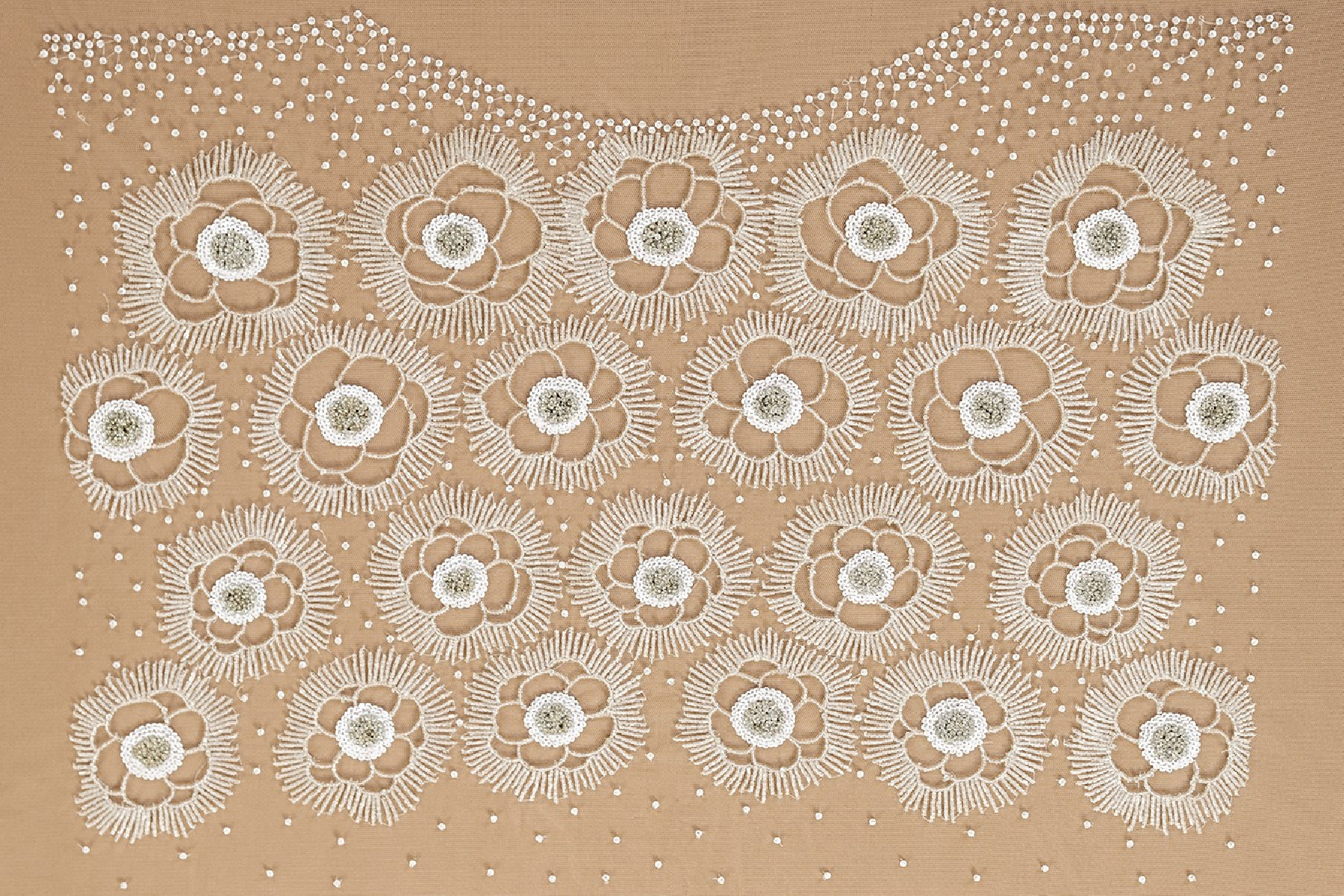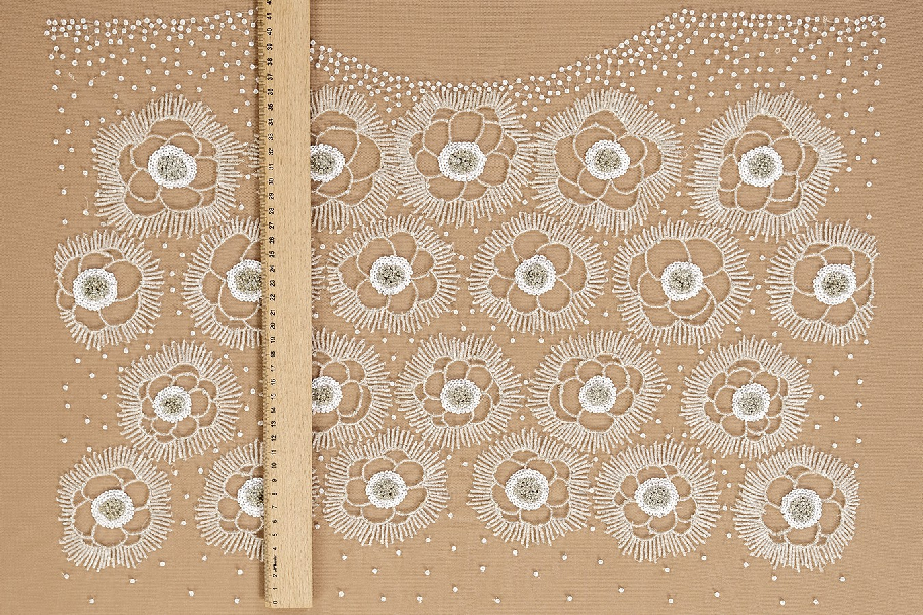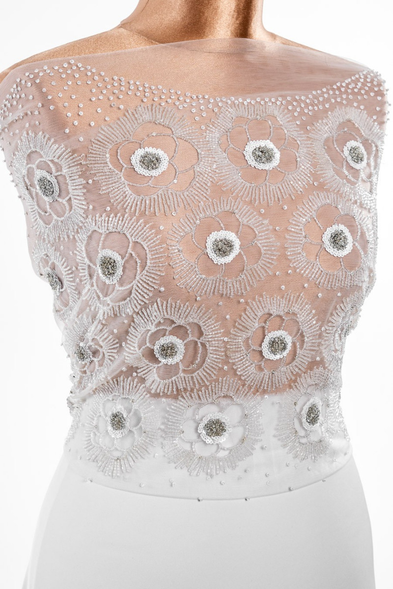 Itāļu kāzu aplikācija korsetes formā (blūze - priekšpusē) krēmkrāsā ar baltiem un sudraba aksesuāriem. Skaists lielu ziedu (9 cm) motīvs, kas izgatavots no caurspīdīgām pērlītēm un sudrabaini baltiem fliteriem. Viss ir šūts uz mīksta tilla.