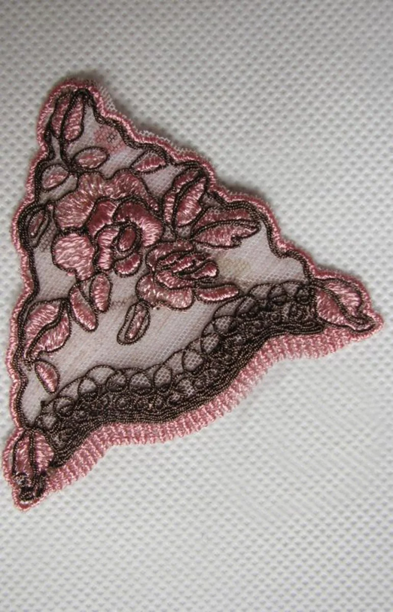 Galantērijas ziedu aplikācija netīrā rozā un brūnā krāsā.