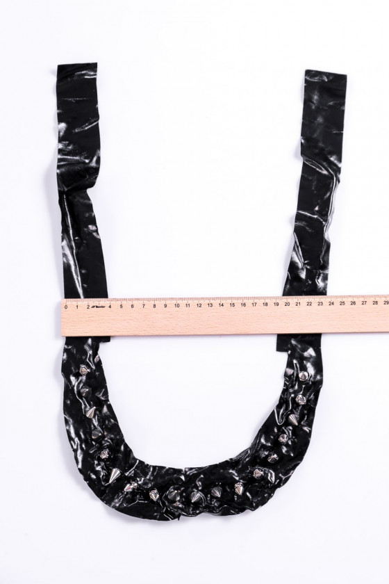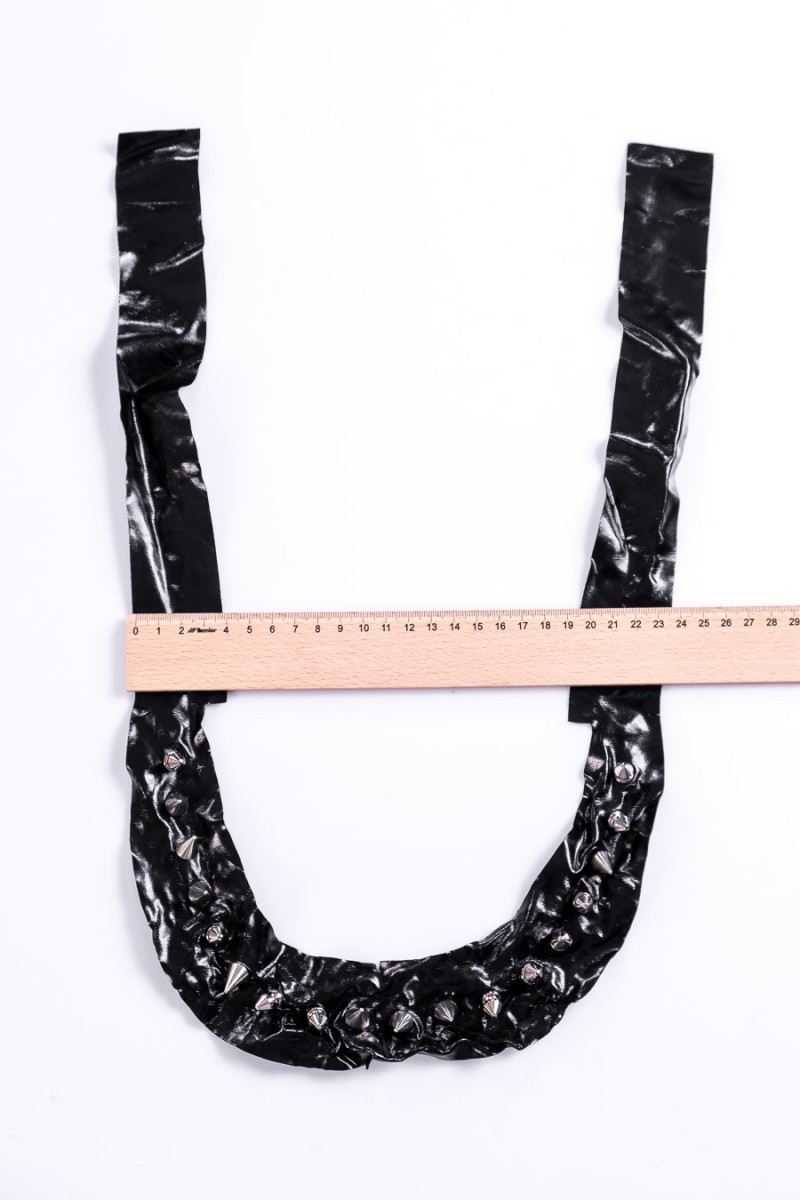 Melns latekss ar kniedēm, kas sagrieztas kakla izgriezuma formā. Lateksa lentes garums – 90 cm, kniedes – 18 gab. Kniedes var atskrūvēt.
