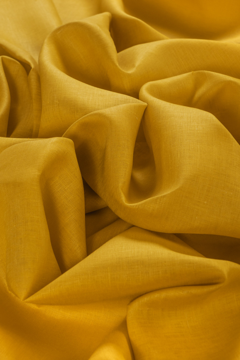 Itāļu 100% lina audums sinepju krāsā. Lins ir ekoloģisks audums, tas ir izgatavots no augu šķiedrām. Tas padara to pilnībā sadalītu, tāpēc lina audumi ir droši videi.