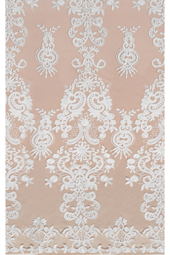 Itāļu mežģīnes krēmkrāsā. Skaists austrumu rakstu motīvs vertikālu paneļu veidā 25 cm platumā, kas savienoti ar mazāku elementu (8 cm), raksta augstums ir 135 cm. Audums ir pabeigts vienā pusē ar zobu - mēs to šujam apkārtmēr. Lieliski piemērots kāzu un vakara tērpu šūšanai.