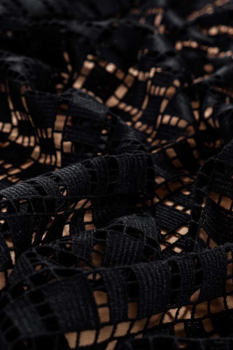Itāļu guipure mežģīnes melnā krāsā ar neregulāru dūriena motīvu. Audums ir lieliski piemērots elegantas blūzes, svārku vai kleitas šūšanai. Sastāvs: 50 % dabīga vilna, 50 % poliesters