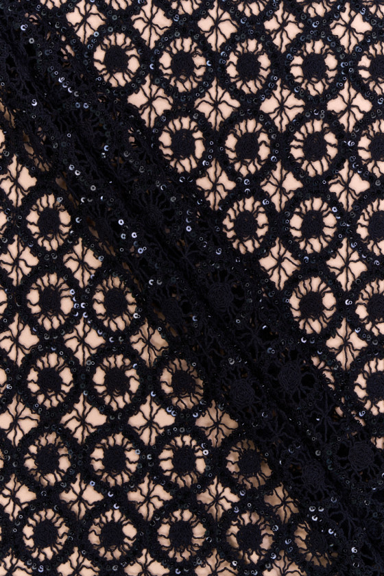 Itāļu mežģīnes ar ažūra rakstu melnā krāsā, dekorētas ar melnām pērlītēm un fliteriem. Audums ir mīksts, caurspīdīgs, neelastīgs un tam ir maigs spīdums, pateicoties izmantotajām pērlītēm. Fantastiskas mežģīnes, kurām ir daudz pielietojumu, var izmantot, lai uzburtu kleitas, blūzes, svārkus, topus, kā arī izmantot apdarei.