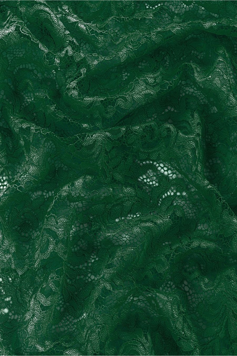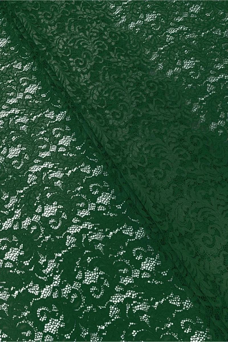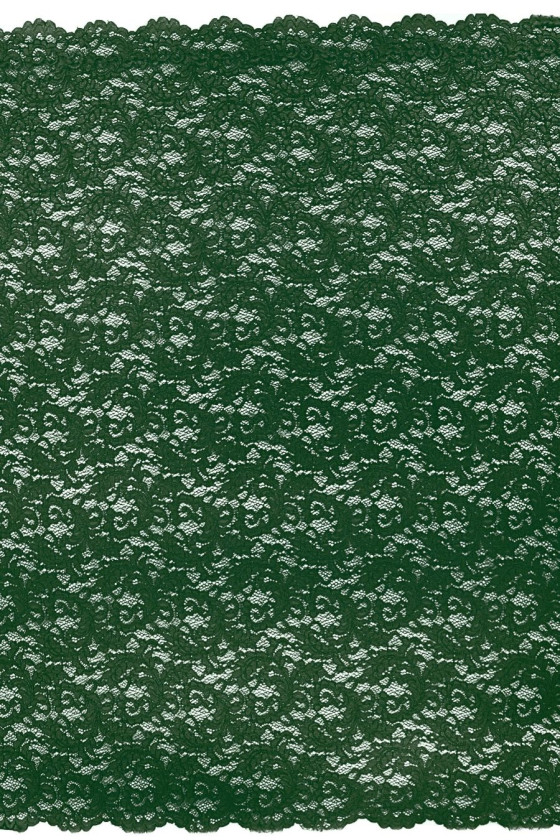 Itāļu mežģīnes zaļā krāsā. Audumam ir blīvs ziedu motīvs, kas savienots ar sietu un pabeigts ar auklu. Kronis ir pabeigts abās pusēs ar dekoratīvu zobu - mēs to šujam apkārtmēr. Brīnišķīgs piedāvājums, kas darbosies gan formālos, gan ikdienas tērpos.