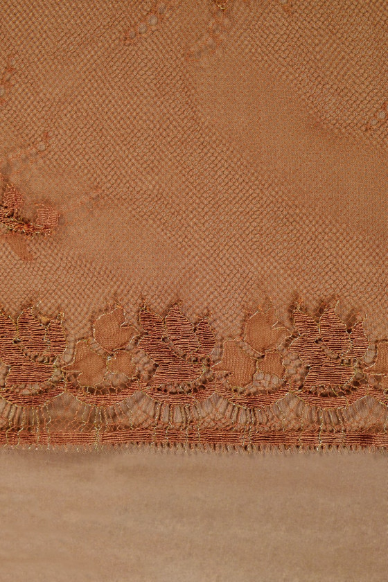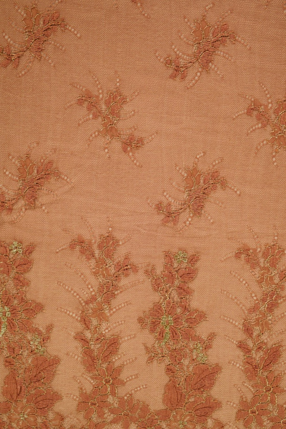 Skaistas sarkanas mežģīnes ar zelta lurex diegu. Audums ir pabeigts no abām pusēm ar asimetrisku zobu (pašgriešanai). Modelis notiek perifēri. Mežģīnes ir 95 cm platas. Ideāli piemērots blūzēm, kleitām.