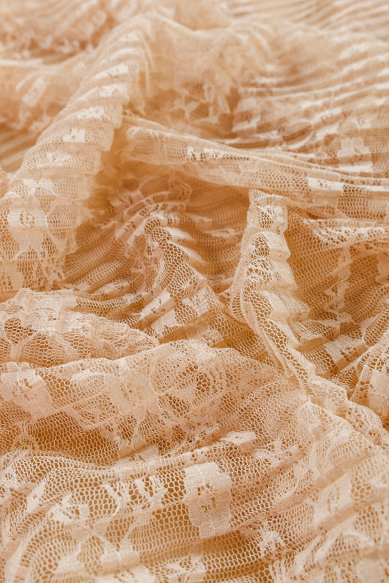 Skaistas kroku mežģīnes smilškrāsā. Smalks, elastīgs. Ideāli piemērots kleitām vai blūzēm.