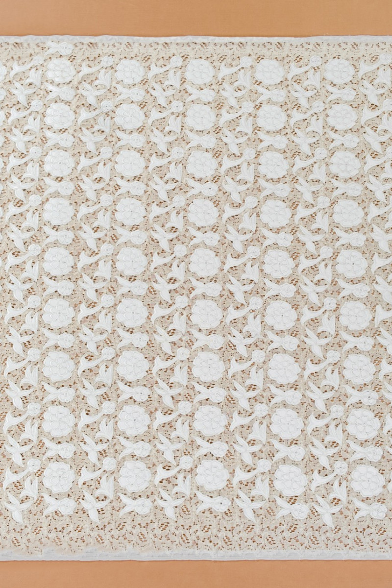 Uz krēmkrāsas (gaiši bēšām) mežģīnēm uzšuj baltus eko-ādas ziedus. Audums paredzēts kleitām, blūzēm un svārkiem. Neelastīgs audums.