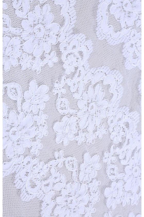 Mežģīnes kāzu kleitām vai blūzēm. Uz tā ir regulāras sloksnes, kuras var sagriezt. Neelastīgs audums.