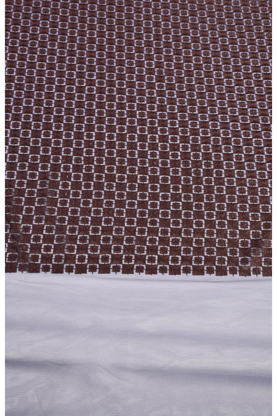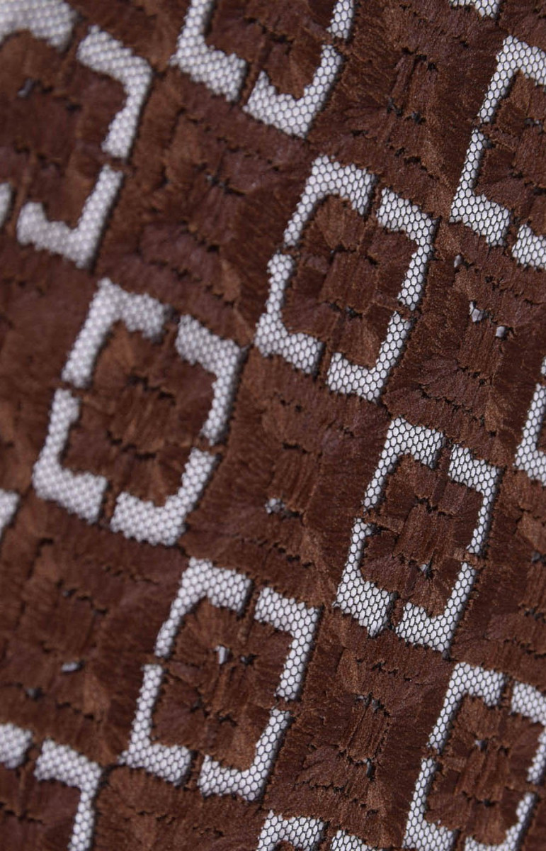 Mežģīnes ar ģeometrisku rakstu. Audums ir apvienots ar tilla. Auduma platums ir 140 centimetri, no kuriem 90 cm ir mežģīnes, 50 cm ir tills (melns)