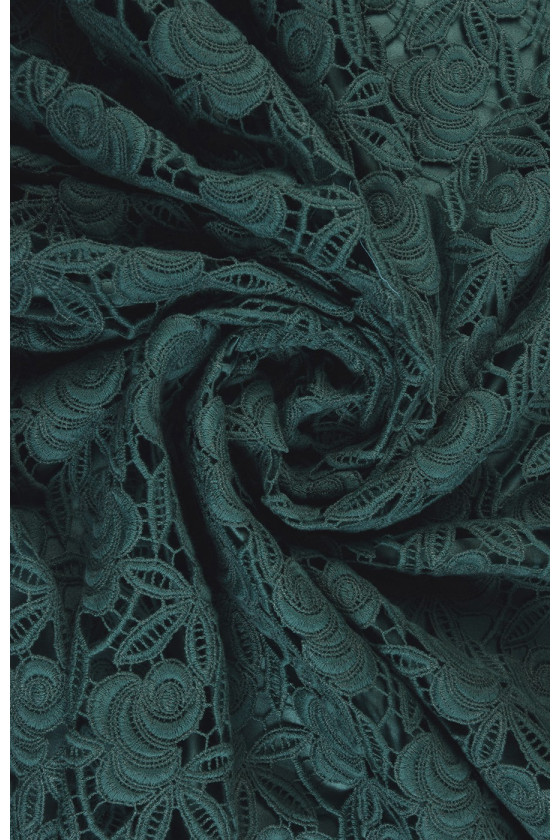 Guipure mežģīnes ar klasisku rakstu jūras zaļā krāsā. Lai iegūtu skaistu efektu, iesakām izvēlēties oderi, piemēram, no zīda satīna.