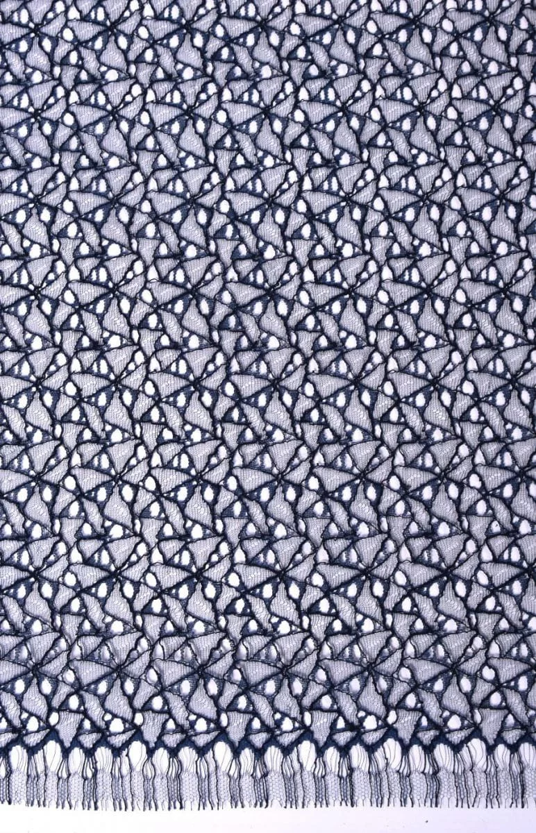 Itāļu mežģīņu audums tumši zilā krāsā kupona izmērā 160cm*90cm. Smalkais, blīvais raksts, kas atgādina ziedus, ir apgriezts ar auklu. Audums abās pusēs ir pabeigts ar dekoratīvu zaru. Ļoti oriģināls piedāvājums blūzes vai svārku šūšanai cilvēkiem, kuriem patīk oriģināli raksti.