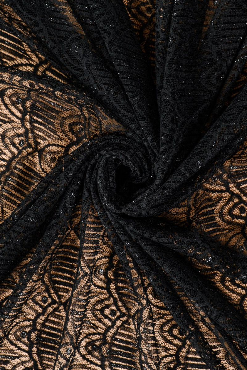 Mežģīnes ir 150 cm platas. Melnās viskozes un lurex pavedienu kombinācija. Tas dod spīdīga auduma efektu. Ieteicamais lietojums: garas kleitas vai blūzes.