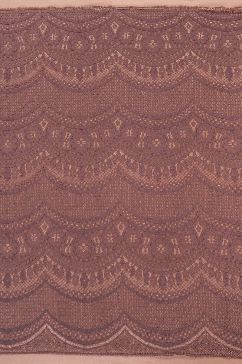 Skaistas franču mežģīnes bordo brūnā krāsā. Ļoti interesants viļņu un ziedu motīvs. Mežģīnes ir šauras (90 cm platas), raksts notiek apkārtmēr. Pabeigts abās pusēs ar zobu - pašgriešanai. Ideāli piemērots blūzēm un kleitām.