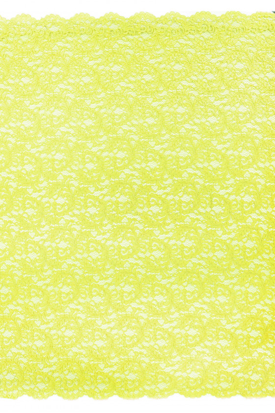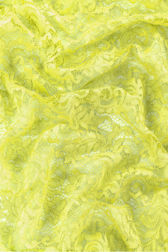 Itāļu laima zaļās mežģīnes ar blīvu ziedu motīvu. Audums ir mīksts, neelastīgs, no abām pusēm pabeigts ar dekoratīvu zobu. Ideāls piedāvājums kleitas, svārku vai blūzes šūšanai.