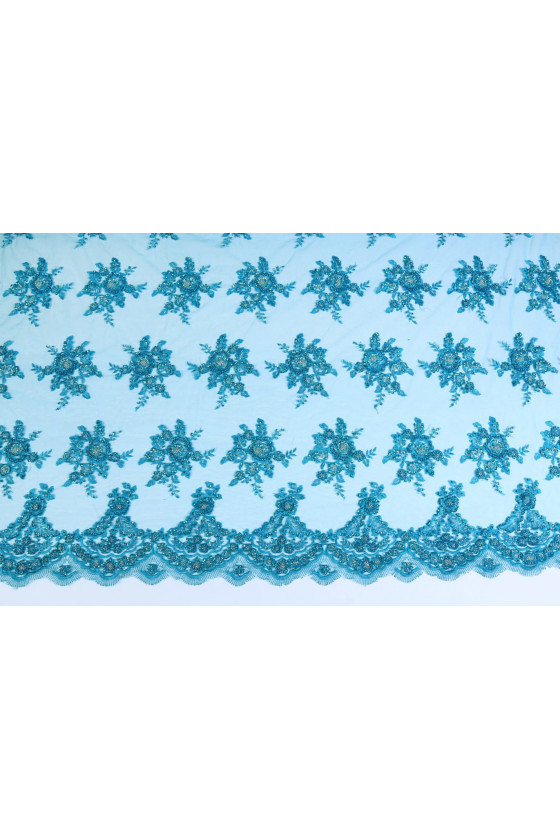 Skaistas mežģīnes, kas izšūtas ar pērlītēm. Audums nav elastīgs, smags, abās pusēs pabeigts ar zobu. Ideāli piemērots kleitām vai blūzēm.