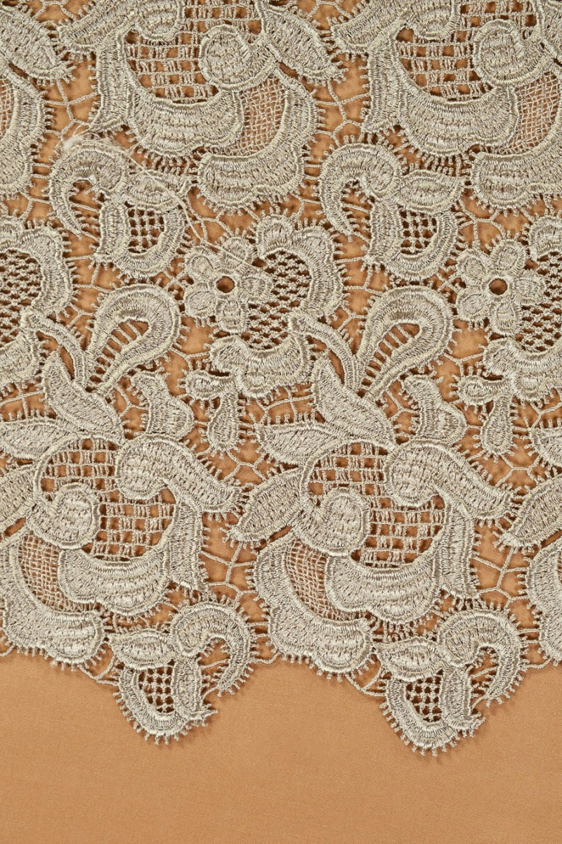 Gupure mežģīnes ar klasisku ziedu rakstu aukstā bēšā krāsā. Lai iegūtu skaistu efektu, iesakām izvēlēties oderi, piemēram, no zīda satīna.